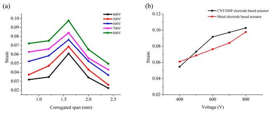 To test the actuating performance of the printed corrugated PVC gel core layers, three pieces of PVC gel from each of the five experimental groups with varying spans and four pieces of zinc foil electrode (40 mm × 20 mm × 0.07 mm) were superimposed to make a metal electrode-based PVC gel actuator. At different voltages (400 to 800 V, 1 Hz, 50% duty cycle square wave), the strain of the actuators was tested as a function of the corrugated span of core layers, as shown in Figure 8a. The strain of each actuator increased with an increase in voltage. As the corrugated span increased, the strain at each voltage exhibited a single peak form that increased first and then decreased. The corrugated PVC gel with a span of 1.6 mm had the best actuating performance, and the strain of the actuator using this kind of PVC gel core layer reached 9.9% at 800 V. Overall, the PVC gel printed using the additive manufacturing method described in this paper had good electro–deformation performance. Additional experiments in this study used a corrugated PVC gel with a span size 1.6 mm.