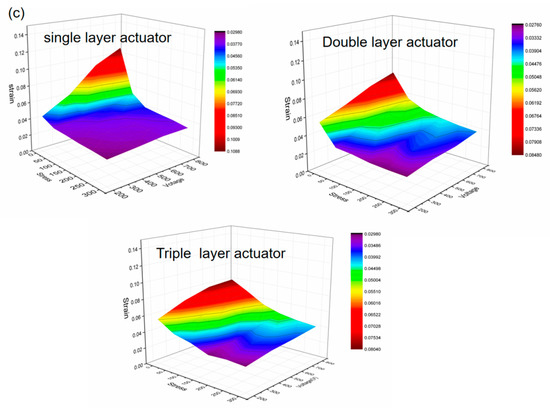 For testing the actuating performance of the corrugated PVC gel actuators obtained by integrated printing, the strain–voltage (400 to 800 V, 1 Hz, 50% duty cycle square wave) relationship without load and the strain–load (0 to 70 g) relationship (constant application of 800 V, 1 Hz, 50% duty cycle square wave) of the actuators with varied number of layers (1 to 3) were measured. As shown in Figure 8c, at the same voltage and as the number of layers increased, the strain gradually decreased: at 800 V, the strain of the single layer actuator was as high as 10.9%, the strain of the double layer actuator was up to 8.5%, and the strain of the triple layer actuator reached 8.0%. Since the insulating layers in the multilayer structure increased the total thickness, the strain of the actuators typically decreased to some extent as the number of layers increased. As the load increased, the strain gradually decreased, and the speed gradually slowed. The fewer number of layers, the faster the decreasing speed. When subjected to the same stress (0 to 300 kPa) at the variable voltage (200 to 800 V), the strain increased with the number of layers. As the number of superimposed layers increased, the total output force of the actuator increased, so the load carrying capacity increased and, thus, the negative effect of load on the actuating strain decreased accordingly. The performance of our printed actuators is better than that of the actuators made by casting reported in the literature [37].
