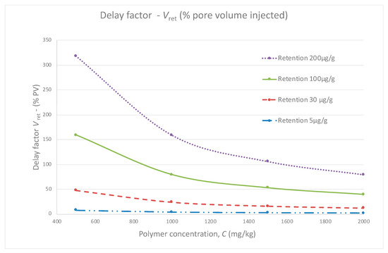 With Vret the pore volume delay, ρrock the rock density, φ the porosity in %, Rpret the polymer retention in μg/g and Cpolymer the polymer concentration in parts per million. Considering a density of 2.65 g/cm3 and a porosity of 25%, it is possible to draw a simple graph showing the pore volume delay for various polymer concentrations and retention values.
