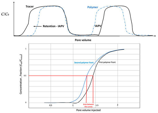 The second approach, called dynamic, considers the injection of one or several polymer fronts with a tracer [17,18]. In the case of 2 fronts with tracer, the retention is determined by the area between both normalized polymer curves, at the 0.5 cut-off of the ratio (concentration effluents/initial concentration). The tracer is used to determine inaccessible pore volume (IAPV) (Figure 2). In this paper, two methods were compared: the two fronts described in Figure 2 and another consisting in considering only the first polymer and tracer fronts and measuring the respective concentrations during build-up and water flush (Figure 3).