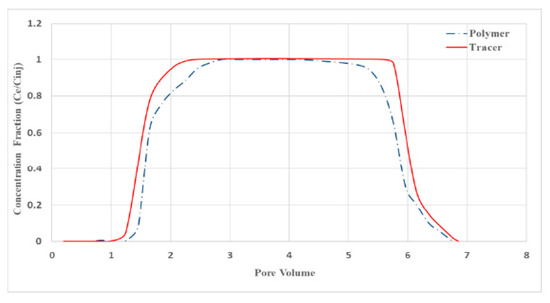 The fluids under study, including water and the indicator (tracer), can pass through the entire pore volume of the porous medium. In addition, there is often a portion of the pore volume into which polymer molecules cannot penetrate. This volume is referred to in the literature as the inaccessible pore volume (IAPV) [18,24]. Inaccessibility of a part of pores for the polymer is usually associated with the large size of macromolecules and their elastic deformation.