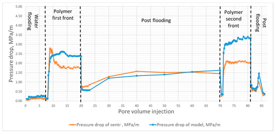 The experiment methodology corresponded to generally accepted approaches, where formation water was pumped through a composite core model of initial oil saturation (Kio) and residual water saturation (Krw) to create residual oil saturation (Kro), thus simulating the 2nd stage of field development. Next, simulating the 3rd stage of field development, several pore volumes of polymer solution were sequentially pumped through that composite core model now having its residual oil saturation (Kro) (first front); then it was washed with simulated formation water and pumped with the polymer solution again (second front).