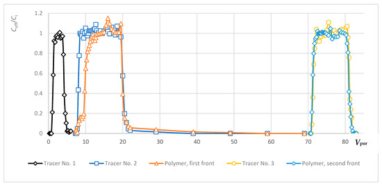 Even a plain visual analysis of the presented curve entails several conclusions. The first black peak (black diamond curve) in the figure shows an increase and decrease in concentration of non-sorbable tracer No. 1 in aqueous medium. A similar non-sorbable tracer was used with the first polymer front (dark blue line with squares). One may see that the rate of reaching the maximum concentration of 100% (the normalized value in the Ceff/Ci = 1 plot) does not depend on whether the tracer propagates in water or with the polymer front. The slopes of the gray and dark blue lines remain constant. Meanwhile, the advance of the polymer front (orange line, triangles) significantly lags behind the non-sorbable tracer due to retention of the polymer.