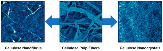 From cellulose pulp fibers to CNFs and CNCs. The photo of the cellulose pulp fibers was obtained using a scanning electron microscope (500 × 500 µm), while those of CNFs and CNCs are atomic force microscopy images (5 × 5 µm).