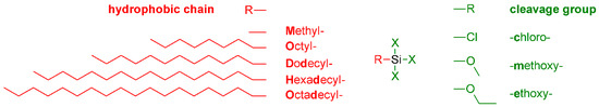 Silylation or silanization is a ubiquitous, effective, and easy method for surface hydrophobization via grafting. Here the hydroxyl groups of cellulose undergo a condensation reaction with a wide range of silanes. Those silanes are generally alkoxy- (methoxy-, ethoxy-) or chlorosilanes, which have additional organic functionality, representing the hydrophobic part of the molecule (see Figure 2; nomenclature for silanes throughout this review: “hydrophobic chain type” + “number of cleavage groups” + “cleavage group type”-silane, e.g., methyltrichlorosilane, abbreviation MTCS).