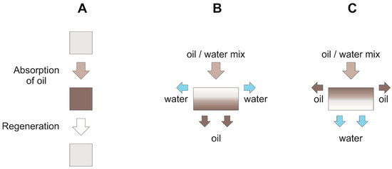 Separation mechanism of 3D materials: (A) absorber type; (B) hydrophobic filters; (C) hydrophilic filters.