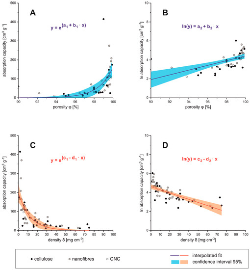 whereas would be the density of the final aerogel, and is the density of the precursor, e.g., pure lignocellulose before aerogel formation. The higher the porosity of the absorber material, the higher is also the absorption capacity. Below 95% porosity the absorption capacity comes close to zero, which can be considered as the technical limit for those materials (see Figure 5A). The logarithmic absorption capacity is then almost proportional to the porosity, and becomes zero at low porosities (see Figure 5B). Vice versa, for high densities (>50 mg cm−3) the absorption capacity approaches the zero value (see Figure 5C,D). These relations can be fitted by an exponential expression (parameters see Table 4).