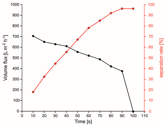 For filter-like 3D materials it was found in general that with increasing flux, also the separation efficiency reduces significantly (see Figure 6 [77]). Fluxes range between 120 [54] to 4200 [85] L m−2 h−1 for hydrophobic materials and 360 [164] to 22,900 [102] L m−2 h−1 for oleophobic materials. Separation efficiencies are typically between 98% up to nearly 100%. Particularly some oleophobic materials obtain high flux rates with high separation efficiency (22,900 L m−2 h−1, 99.8% [102]) and could, therefore, be highly promising as 3D filters.