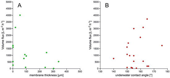 Volume flux of membranes depending from membrane thickness (A) and UWCA (B).