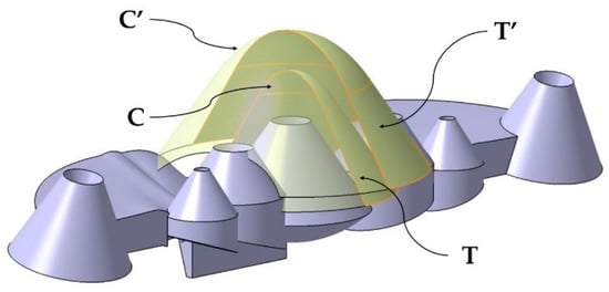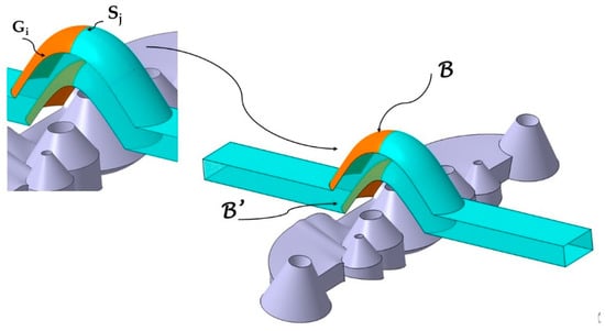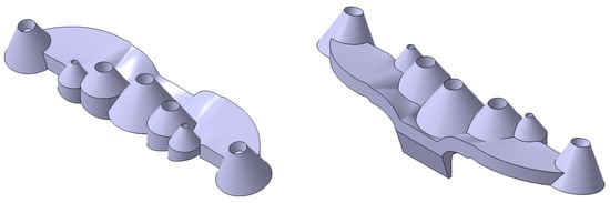 The generating curves Sj and the guide curves Gi are the basis for obtaining the complex surfaces B, B′ superior and inferior to the conformal channel in each collimator. The objective is to design surfaces B, B′ that allow the obtention of conformal cooling channels with a constant section and that, at the same time, are adaptable to the geometry of each collimator. Additionally, the newly designed conformal channels meet DfAM manufacturing criteria [39]. Figure 7 shows the surfaces B, B′ of the central conformal channel obtained from the sweep of the generating curves Sj along the guide curves Gi. The same geometric procedure has been followed with the rest of the collimators, obtaining two lateral channels and two end channels as indicated in Figure 8.