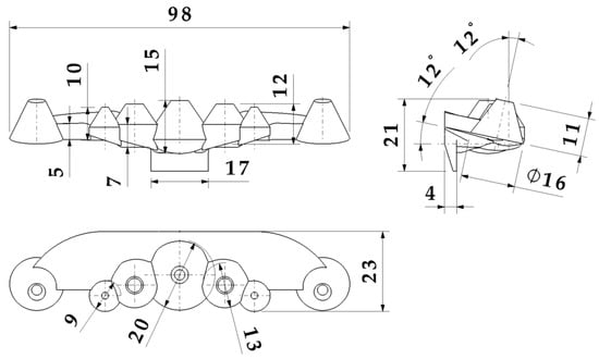 The optical part under study is made up of a set of seven truncated conical collimators, with heights between 10 and 15 mm and base diameters between 9 and 20 mm. The collimators present variable lateral slopes with intersections in their base zone, which produce an overlap of the collimating surfaces. The optical part has a small topology with a 98 × 23 × 21 mm bounding box. The vertical axis of the five central collimators is perpendicular to the horizontal plane of the optical piece, while the two end collimators have an inclination angle of 12 degrees with respect to the ZX coordinate plane. The seven collimators are located on a base freeform platform in the optic piece, having a thickness of 5 mm. The gate of the optical part is located on a slanted flange centered on the lateral end of the base platform (see Figure 1). Figure 2 details the dimensions of the collimating optical piece presented in the paper.