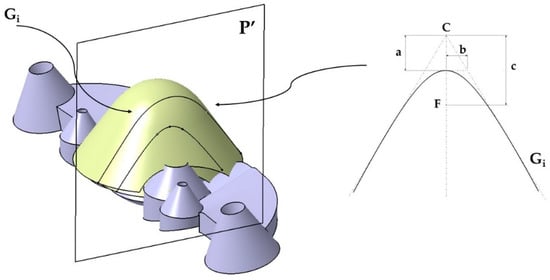 The geometry of the new conformal channels consists of two parallel complex surfaces B, B′ obtained from two generating curves Sj ∀ i [1,2] and two guide curves Gi ∀ j [1,2]. To obtain the guide curves Gi, two truncated conical surfaces T, T′ have been modeled parallel to the surface of each collimator of the optical part. The surfaces T, T′ incorporate two spherical domes C, C′ in the upper part. In Figure 4 the base surfaces T, T′ as well as the domes C, C′ are indicated. A plane P′ parallel to the coordinate plane YX, intersects the complex surfaces T, T′ and C, C′, obtaining as a result two hyperbolic guide curves Gi. The parameters and analytical definitions of the guide curves Gi are indicated in Figure 5 as well as in Equations (1)–(3) where ε is the eccentricity of the guide curve Gi, a the length of the major axis of the curve Gi and b the length of the minor axis of Gi. The parameter c represents the distance from the center C to the focus F of Gi. Figure 5 shows the Gi curves obtained from the intersection of the plane P′ with the surfaces T, T′, C, C′.