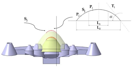 The generating curve Sj consists of two well-differentiated areas L1 and L2 (see Figure 6). In order to avoid the use of supports in the manufacturing of the conformal channels, the generating curve Sj consists of a central zone L1 formed by the locus of the points Pi whose tangent line Ti presents an inclination with the horizontal plane of less than 45°. It is crucial to make sure that the value of L1 does not exceed 10 mm in any case. In this way, material collapses are avoided in the fabrication of the conformal channel [19]. The second part of the curve Sj is formed by the set of points Pj belonging to the geometric locus L2, see Figure 6. The points Pj ∈ to L2 fulfill the condition that the inclination of the tangent line to Sj at each point Pj must exceed 45 degrees. In this way, it is possible to adapt the design of the surface of the conformal channels to the truncated conical geometry of the collimating piece without the need to use supports for its manufacture.