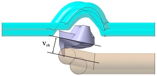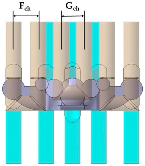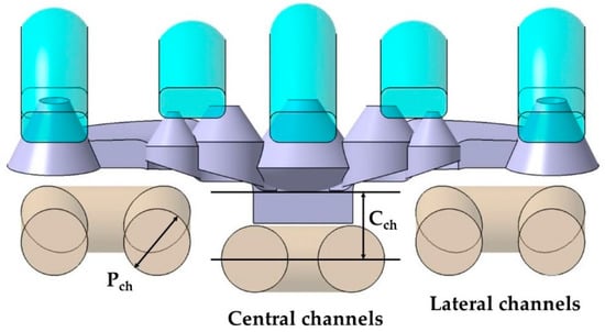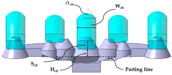 The base of the optical collimators responsible for controlling the LED light is characterized by a spherical dome-shaped geometry in the central collimator, combined with the use of inclined plane geometries in the lateral collimators (see Figure 10). This area requires high levels of surface quality by being molded in the cavity plate of the mold. In order to achieve a cooling that is as uniform and adapted as well as possible to the base of the collimators, a conformal cooling layout has been designed with a circular section and an inclined profile bordering the curved areas of the collimator piece. The objective is to achieve, together with the conformal cooling of the core cavity, the most possibly uniform cooling for the collimating piece that minimizes the warpings caused by a differential shrinkage in areas with a high thickness ratio as much as possible. A series of design parameters capable of obtaining the optimal configuration of the channels at the base of the collimators has been established in the same way as in the conformal layouts designed for the core cavity. The parameters for the cavity plate cooling system are shown in Table 2. Figure 10 graphically indicates the design parameters Pch y Cch of the conformal cooling layout in the zone of the cavity plate. Figure 11 indicates the location of the Vch parameter and Figure 12 represents the Fch and Gch parameters.
