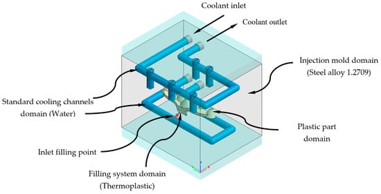 This section describes the configurations defined to carry out the analysis and numerical simulations, from which the thermal and rheological behavior of the geometries and designs of the cooling systems is evaluated (see Figure 8 and Figure 10). By means of this set of numerical simulations, the thermal and dynamic behavior, developed by the coolant flow, is calculated and analyzed, as well as the thermal exchange produced between them, the plastic part, and the injection mold during the cooling phase. In this way, it can be verified and validated if the thermal performance of the results obtained meets the technological requirements demanded by the manufacturing process using plastic injection molds. First, in order to carry out this set of numerical simulations, four main computational domains or 3D solids must be established (see Figure 13 and Figure 14), along with their corresponding material definition. These computational domains are defined as follows: plastic part (PC-Makrolon LED 2245), power system (PC-Makrolon LED 2245), cooling system (water), and injection mold (steel alloy 1.2709). Table 5 and Table 6 show the main physical, rheological, and thermal properties of the materials that were used for each computational domain.