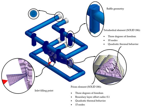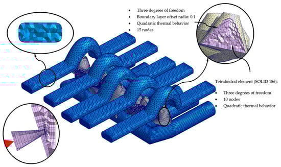 To carry out the different numerical simulations, the main geometry of the cooling channels, plastic part, and injection mold must be previously discretized in finite volumes. The commercial software Moldex 3D R17 [40] has a Moldex Designer mesh module, in which the geometric and technological parameters of the mesh can be configured and established. Table 7 shows the magnitude of the geometric parameters defined during the meshing process, as well as its configuration. The magnitude of these parameters has been established according to the details and geometric features of the plastic part. As shown in Figure 15, the elements that were used as finite volumes, to discretize the proposed geometries, are of the second-order tetrahedron-type (SOLID 186). This means that said elements have the following 10 control nodes: 4 located at the vertex of the element and 6 located in the center of the edges that compose it. Each control node has 3 degrees of freedom, with translation on the main X, Y, and Z axes. The use of this type of element allows the resulting field of displacements and temperatures to be modeled with greater precision.