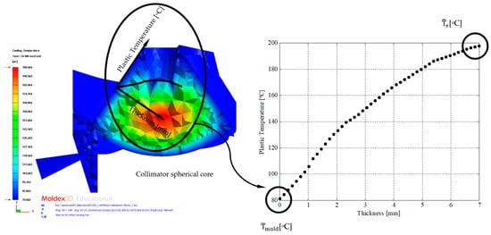 where D [m] represents the distance between the surface of the plastic part and the collimator core, geometric region of the plastic part with the highest temperature (see Figure 17), Tmelt [°C] represents the injection temperature of the plastic front molten (see Table 8), [°C] represents the maximum demoulding temperature in the collimator core of the plastic part (see Figure 17), and [°C] represents the average temperature on the surface of the cavity of the mold (see Figure 17).