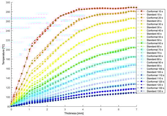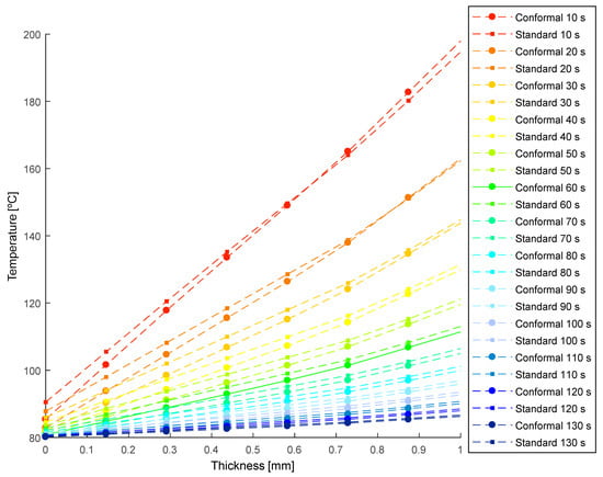 Figure 18 and Figure 19 show the temperature profile obtained, in the collimator region, after transient thermal analyses for the defined cooling systems (see Figure 15 and Figure 16). In this way, from Figure 18 and Figure 19, the thermal performance of both systems can be compared, and the influence of the geometry and typology of the cooling channels used can be evaluated. As shown in Figure 18 and Figure 19, conformal-type cooling channels reduce the surface temperature of the plastic part, [°C], in the collimator region. Moreover, this trend is maintained, significantly, up to thicknesses comprised in the range of 4 to 5 mm. From this range, the temperature profiles tend to be similar. However, the magnitude of the temperature of the plastic part in the collimator core is still lower for the design of the conformal-type cooling system.
