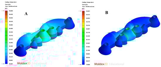 As Table 9 shows, for the design of the conformal-type cooling system, the cooling time obtained is equal to 68 s. While for the standard-type cooling design, the obtained cooling time is equal to 78 s. Therefore, the application of a conformal-type cooling system design reduces, for the case study analyzed in this paper, 10 s and 13% the manufacturing cycle time of the total plastic part. Likewise, taking into account the other technological parameters analyzed, it can be determined that the application of a conformal-type cooling design, for the case study analyzed in this paper, reduces the temperature on the surface of the mold cavity by 1.8 °C, the maximum temperature at the core of the collimator geometry of the plastic part is reduced by 0.7 °C, and the temperature gradient along the surface of the mold is reduced by 0.7 °C. It should be noted that, as shown by the results obtained after the numerical analyses performed (see Figure 21A,B), the conformal-type cooling system improves uniformity throughout the temperature map of the plastic part. This reduces, a posteriori, the gradients, concentrators, and stress distribution associated with temperature changes along the geometric domain of the plastic part.