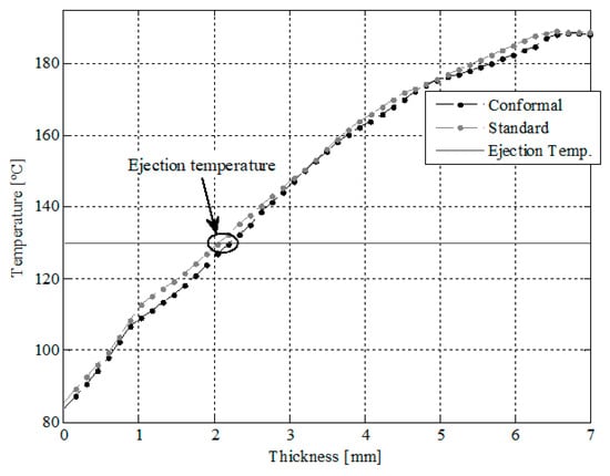 Figure 22 shows the temperature profile of the plastic part versus the thickness for the geometric region of the collimator, at the instant in which the plastic part is ejected. As can be observed in Figure 21, the amount of solidified thickness can be evaluated and that, in addition, it is below the ejection temperature of the plastic material. In particular, for the design of the conformal-type cooling system, the ejection temperature of the plastic material is reached for a thickness in the geometric region of the collimator of 2.0 mm. Whereas, for the design of the traditional-type cooling system, the ejection temperature of the plastic material is reached for a thickness in the geometric region of the collimator of 2.2 mm. Therefore, the use of a conformal-type cooling system, for the case study analyzed in this manuscript, also reduces the amount of thickness in the core of the collimator, which is found to be above the ejection temperature of the plastic material (see Figure 23A,B, and Table 10).
