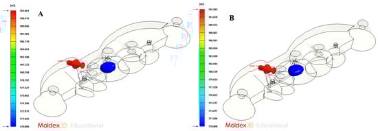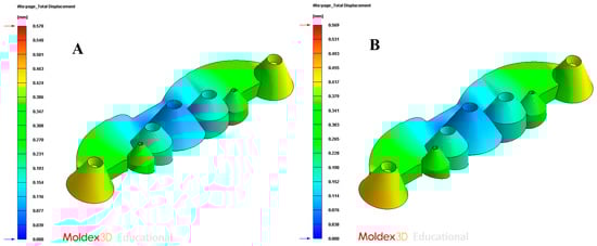 Total warpage displacements. (A) Traditional cooling; (B) conformal cooling.