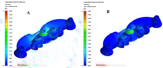 Mold temperature difference. (A) Traditional cooling; (B) conformal cooling.