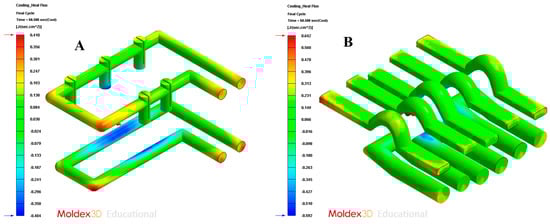 Cooling heat flux. (A) Traditional cooling; (B) conformal cooling.