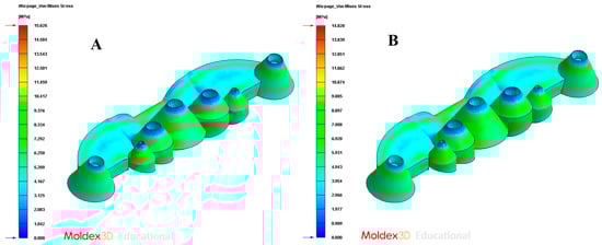 Warpage von Mises stress. (A) Traditional cooling; (B) conformal cooling.