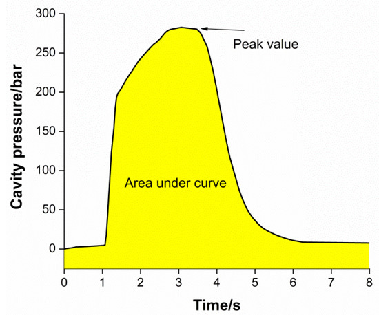 In the process of injection molding, the pressure curves of different molds are not the same, but the general trend of the pressure curves of different molds is the same. They can reflect the flow of melt in the mold cavity and the state of each injection molding shot. It can be observed from the figure that injection molding is a dynamic cycle process, from injection to pressure holding and then to cooling. In addition to observing the general shape of the curve, cavity pressure data are correlated to part quality by deriving quantitative values representing the features of the curve. In the present study, the peak pressure and area under the curve are the two attributes obtained from the curve, as shown in Figure 4.