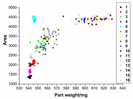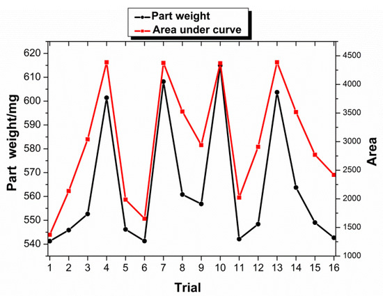 Here, only the area under curve will be presented, since it has a higher R2 value, as discussed earlier. In general, the result obtained from Figure 11 is expected, since trials with low level settings, such as trial 1, trial 2, trial 6, trial 11, and trial 16, produced lighter parts and lower attribute values, while trials with higher level settings, such as trial 5, trial 7, trial 10, and trial 13, produced heavier parts and a greater area under the curve. As shown in the figure, two distinct clusters are observed from in the data, with most of the parts weighing from ~530 mg to ~580 mg and a second group falling in the range from ~590 mg to ~630 mg. This second group consists of trial 3, trial 7, trial 10, and trial 13. Both of these trials were conducted at high-level settings in two of the three processing parameters. The trail 5 has a large area under the curve, but a lower weight, which may be due to the greater influence of the packing pressure. The separation of the trials suggests the possibility of having an excessive gap between each level for the pack pressure setting. Despite the disjointed data, the results show that pack pressure has the greatest effect on part weight.