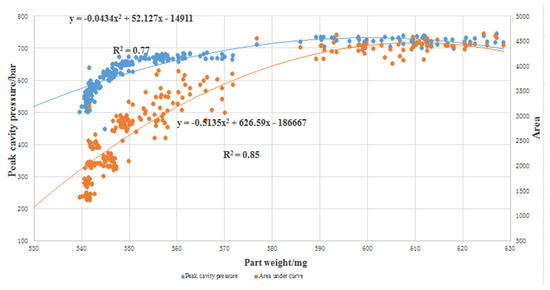 To further investigate the relationship between cavity pressure and part weight, the coefficient of determination (R2 value) was calculated, to determine how well the peak cavity pressure and area under the curve correlate with the part weight. The coefficient of determination is a measure of the degree of correlation or dependence between the dependent and independent variables in a regression analysis. A high R2 value indicates that the two variables are well correlated. The higher R2 value shows that a later switchover in the injection molding process not only produces a better quality part, but also produces a better correlation between part quality and cavity pressure (both peak value and area under the curve). A plot to show the correlation of the average area under the curve and the peak cavity pressure, with respect to part weight, is presented in Figure 10. The distribution of all the shots of both attributes in the DOE trial with respect to part weight. As shown in the figure, both the attributes have good correlation with the part weight.