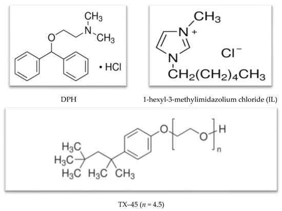 The anti-allergic drug, diphenhydramine hydrochloride, was the product of Molecule-on (New Lynn, Auckland, New Zealand). The non-ionic surfactant, TX–45, and ionic liquid, 1-hexyl-3-methylimidazolium chloride (IL), utilized in this study were purchased from Sigma (St. Louis, MO, USA). The chemicals were utilized as obtained from the supplier, without of additional purification. De-ionized and double distilled water was utilized to prepare all solutions. Specific conductivity was used to check the purity of water (1–6 µS cm−1). The pH values were measured by a pH meter (7). The structure of the drug, surfactant, and ionic liquid are given in Figure 1.