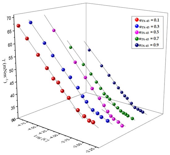 The values of micellar mole fraction of component 1 () are listed in Table 1. On the other hand, the ideal involvement of TX–45 in the DPH + TX–45 mixed micelle can be computed with the help of the micellar mole fraction of surfactant in the ideal state () as follows [57]: