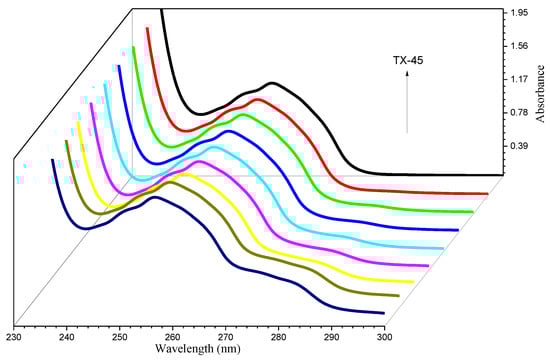 A Thermo Scientific, Waltham, MA, USA, Evolution 300 UV-visible spectrophotometer was used to carry out the experiments. All spectra were noted in the spectral range of 230 to 350 nm (Figure 3). The stock solution of DPH (5 mM) was constructed in water. TX–45 solution (5 mM) was prepared in an already prepared drug solution to keep the drug concentration constant throughout. The spectrophotometer was used to analyze these already prepared solutions to observe the effect of TX–45 concentrations on the UV-visible spectra of DPH. To observe the ionic liquid effects, all the solutions were prepared in 25 mM aqueous IL solution instead of water.