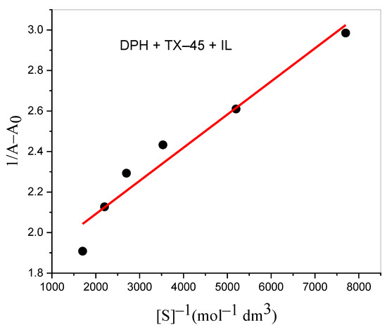 where [S] is the concentration of TX–45, and A, A0 and Amax are the absorbance values of DPH in the presence of TX–45, in the absence of TX–45, and the absorbance owing to the creation of the drug–surfactant complex. A straight line is obtained on plotting 1/(A − A0) against 1/[S] (Figure 4) that also indicates the formation of the 1:1 complex. The binding constant is calculated (intercept/slope) from the Bensei-Hildebrand equation. The obtained binding constant values (K) are 2.46 × 102 and 9.38 × 103 M−1 for DPH + TX–45 and DPH + TX–45 + IL, respectively. The DPH shows more binding affinity toward TX–45 in the presence of IL, confirmed by the K values. It is clear from Figure 4 that the linear plot is obtained when n = 1 for DPH + TX–45 mixtures in the presence and absence of IL, indicating 1:1 stoichiometry. The equilibrium processes can be expressed as follows: