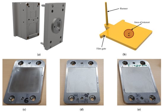 Applied equipment for the production of injection molded parts with specified roughness values. (a) Mold with interchangeable inserts. (b) Injection molded part with a dimension of 60 mm × 60 mm × 4 mm applying an insert without a specified roughness. (c–e) Provided mold inserts from Richard Hiebler GmbH., Stainz, Austria, with target line roughness values of 0.2 m, 0.8 m, and 3.2 m to produce rectangular shaped parts with a dimension of 60 mm × 60 mm × 2.5 mm.