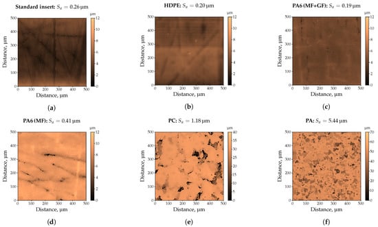 Preliminary investigations on the impression quality of commercially available thermoplastics by means of a confocal microscope. A cut-off wavelength of 71 m was selected. (a) Standard insert: = 0.26 m. (b) HDPE: = 0.20 m. (c) PA6 containing mineral filler (MF), and glass fiber (GF): = 0.19 m. (d) PA6 containing mineral filler (MF): = 0.41 m. (e) PC: = 1.18 m. (f) PA: = 5.44 m.