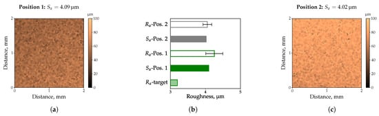After the preliminary investigations, the roughness was determined at two positions in the middle area of the sample, i.e., on the surface where the film gate is located (cf. Figure 1). For each position, five line measurements with a spacing of 1 mm, and for the surface roughness measuring areas of 0.25 mm, and 4 mm, respectively, for selected samples were defined. Due to the limited measurement possibilities at the FRT, e.g., maximum measurement area of 2 mm × 2 mm, cut-off wavelengths deviating from the standard were selected for the area measurements. This is permissible, if the samples to be examined exhibit minor or no waviness. Finally, [38] and [39] can be calculated by: