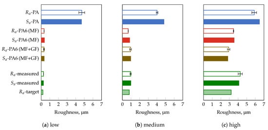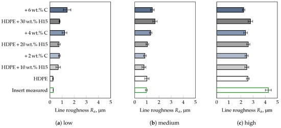 Relative to the insert with the lowest roughness, the S-value of the insert with the highest roughness is 62.91 m ± 3.03 m, i.e., a factor of about four higher. In addition, this insert exhibits the highest -value of 34.42 m ± 1.78 m, which corresponds to a factor of six compared to the insert with the lowest roughness. Because of this six times deeper valley, the HDPE tested will freeze at a selected mold temperature of 45 °C even before reaching the bottom of the valley, preventing a complete impression (cf. Figure 8c). An addition of fillers or compatibilizer to the HDPE generally does not significantly affect the molded roughness of the part (cf. Figure 11), because the applied fillers can penetrate the valley formed by S and , since and . In this case, the impression quality is primarily dominated by solidification processes of the polymer matrix.