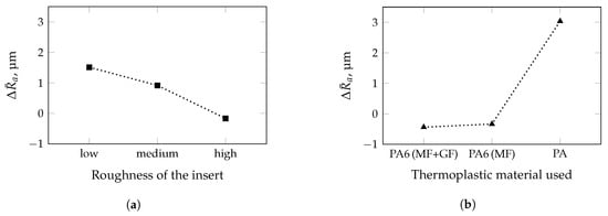 In general, it can be observed that both, and match if the specimens do not exhibit any curvature. In the case of curvatures due to shrinkage and warpage, it is mandatory to proceed according to ISO 4288 [37] with cut-off wavelengths shown in Table 5. Thus, only the results of the line roughness values will be discussed in more detail. A perfect impression can only be achieved by utilizing the mold with the insert of medium roughness and PA6 (MF + GF) as material. All other combinations of insert roughness and thermoplastic material affect the impression quality, i.e., difference between part and insert roughness. For the two differently filled PA6 grades, the molded roughness is about 20% higher for the insert with the lowest roughness. In contrast to that, an opposite trend for the insert with the highest roughness can be observed. The filled PA reveals almost an independence between the insert and the molded line roughness of the specimen, resulting in the highest -values of 4.70 m, 4.02 m, and 5.88 m. Hence, a multivariate analysis of variance (MANOVA) was performed to test the influence of the insert roughness and the material on the impression quality. Within a 95%–confidence interval, the insert roughness as well as the thermoplastic material is statistically significant (Figure 5). As illustrated in Figure 5a, applying the insert with the lowest roughness results in average to a higher roughness on the molded part ( = +1.5 m). Continuing to increase the roughness of the insert leads to a decrease of , i.e., the difference between the roughness of the molded part and the insert roughness is reduced. The opposite behavior can be observed when different thermoplastic materials are used (Figure 5b). For both types of PA6, the impression quality leads to negative but almost identical –values. However, for PA a disproportionate rise in the –value is the outcome of the MANOVA. Thus, the results of the conducted MANOVA confirm the assumption that the filler geometry and size have by far the strongest impact on impression quality.