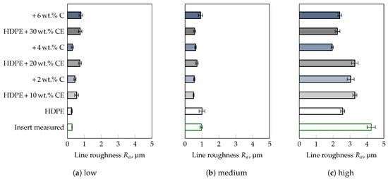 In general, the compatibilizer is chemically bonded to the filler, resulting in an expansion of the filler diameter, and -value, respectively [23]. Another indication that the commercial thermoplastics are composed of fillers with a higher -value, is that the addition of the compatibilizer causes a shift to higher -values, at least for inserts with low and medium roughness. So far, the only unanswered question is why the impression quality of the insert with the highest roughness follows a different trend compared to the inserts with low and medium roughness. Therefore, profile parameters like the average peak-to-valley height , as well as the mean distances between the local (positive) peaks S of the measured line profiles of the several inserts will be discussed in more detail. As shown in Table 7, the inserts with low and medium roughness exhibit almost the same S-values, i.e., mean distance of local profile peaks S. However, the mean peak-to-valley height increases by a factor of about two. -values in this range enable the unfilled HDPE to completely fill the valleys represented by S and before the flow front starts to solidify on the cavity wall, which is cold compared to the melt temperature.