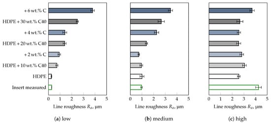 For the inserts with low and medium roughness, the constraints and are only fulfilled for the filler CalPlex Extra. All other fillers showed significantly higher D-values (cf. Table 1), preventing the filler particles from entering the valleys. In addition, an increase in the filler content rises the material viscosity. This impairs the flow properties leading to an earlier solidification of the flow front. As a result, the filler geometry is more likely to be molded, leading to a complete independence between insert roughness and impression quality, as observed for instance, for PA (Figure 4) and HDPE + 30 wt.% C40 + 6 wt.% C (Figure 8) samples.