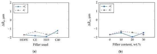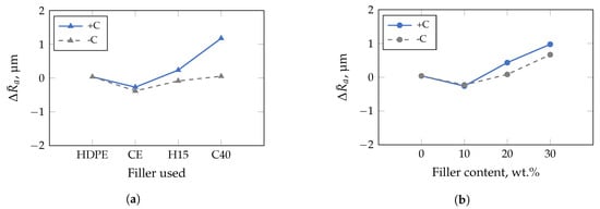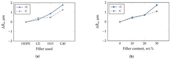 For the insert with low roughness (Figure 9), the impact of the median particle size in ascending order, i.e., corresponding to the filler type used, is shown in Figure 9a. With increasing filler size, e.g., -value of 0.75 m–0.9 m for CalPlex Extra (CE), 5.4 m for Plustalc H15 (H15), and 16 m–25 m for CalPlex 40 (C40), increases. The roughness of the component is only affected by the compatibilizer at -values of ≥5.4 m (filler Plustalc H15). For lower -values of the filler, almost no difference between the specimens with and without compatibilizer is detectable. An increasing filler content causes a linear increase of , as shown in Figure 9b. Adding compatibilizer only affects the impression quality at a filler content of 30 wt.%. However, relative to the insert with low roughness, the results of the insert with medium roughness show a slightly different behavior (Figure 10). Even the addition of the filler with the lowest -value (CalPlex Extra) reduces the molded roughness, i.e., lower -values compared to the unfilled HDPE. As the -value increases, the increases again linearly, but can not reach the -value of the unfilled HDPE. A similar behavior is achieved by adding the compatibilizer. Nevertheless, the increase in the molded roughness value for the samples with compatibilizer is more pronounced (Figure 10a). The same behavior can be observed during an increase of the filler content, whereby the change of for the samples without compatibilizer is more prominent compared to the filler diameter (Figure 10b).