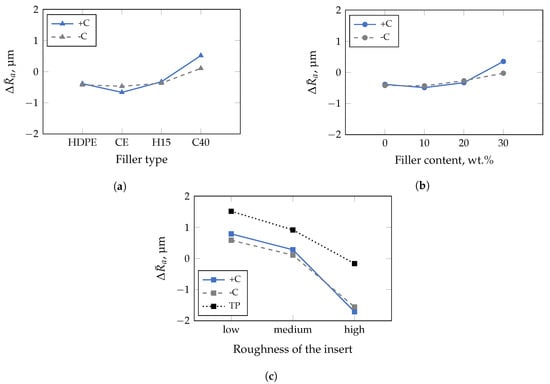 Both, the filler used as well as the filler and compatibilizer content affect the impression quality within a 95%-confidence interval of the conducted MANOVA significantly when applying the insert with the highest roughness (Figure 11). In addition, no clear trend could be confirmed, as the -values are within −1 m and −2 m. Accordingly, other influences on the impression quality must exist, which have not yet been taken into account. The results of the general case, i.e., when all studied insert roughnesses are considered in the MANOVA, are illustrated in Figure 12. In this case, even the unfilled HDPE is molded worse, i.e., recognizable by a negative -value (Figure 12a). In addition, a critical -value seems to exist, which impacts the impression quality, since increases significantly with the addition of CalPlex 40 (highest -value). An analogy could also be observed in the preliminary investigations with PA, where the impression quality was almost not affected by the insert roughness applied (cf. Figure 4). Furthermore, the compatibilizer influence on the impression quality is more pronounced for fillers with high -values than for low ones. Similar relationships, as observed for the filler used, are valid for an increasing filler content (Figure 12b). The impact of the applied insert roughness on impression quality is shown in Figure 12c for the general case. As already discussed in Figure 5 for the commercial thermoplastic materials (black dotted line in Figure 12c), the trend of the impression quality is quite similar for the filled HDPE (gray dashed line). However, a significant shift in is evident, resulting in smoother surfaces when using the fillers compared to the commercial thermoplastic materials, which are filled with unknown filler types. One reason for the shift in could be the higher content of fillers (>47 wt.%), determined by TGA, and shown in Table 6. Another reason could be related to the fact that the commercial thermoplastics are filled with fillers having a significantly higher -value (>25 m). Both factors have a strong influence on the -value, since the influence of the filler diameter and the filler content amplify each other. Furthermore, the addition of a compatibilizer increases the -value for the inserts with low and medium roughness but it causes the for the insert with the highest roughness.