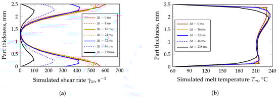 Simulated shear rates and temperature distributions 297 ms after the start of the filling phase (HDPE, center of the molded part). The time steps represent the decrease due to solidification processes at the cavity wall. Simulation parameters: (i) 20 elements in thickness direction, (ii) thermal conductivity of the mold = 29 W m K, and (iii) heat transfer coefficient between steel, and melt of = 5 kW m K. (a) Shear rates at the cavity wall decreases significantly after = 24 ms. (b) Shear dissipation caused by the film gate leads to an increase in the average melt temperature of about 25 K.