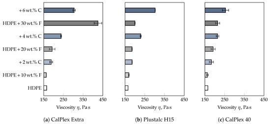 Viscosity values in the linear viscoelastic range (strain of 10%), obtained at a test temperature of 215 °C and a shear rate of 500 s. Fillers with (a) small diameters (CalPlex Extra) cause a more pronounced increase in viscosity compared to fillers with (b) medium (Plustalc H15) and (c) high (CalPlex 40) -values. Compatibilizer is marked as C and the filler as F.