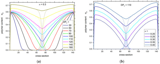 The dynamics of complex systems like brushes is apparently connected to their internal structure and density. The polymer density profiles across a slit formed by a pair of grafted surfaces are presented in Figure 1. One can observe in Figure 1a that quite different polymer systems were under consideration: from two layers separated by a wide gap (ca. 40 lattice units) in the case of short chains (DPn = 30) to a system with an almost constant density of polymer beads across the slit (DPn = 160). This allows distinguishing two regions: (1) regions without brush interpenetration and (2) regions with interpenetration. The regions without interpenetration exhibit density profiles that are mostly linear, which agrees well with the SCFT calculations for polydisperse brushes. One can observe in Figure 1b that the increase in grafting density leads to higher density, but it does not change the shape of the density profiles.