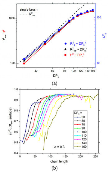 Mean squared end-to-end distance R2ee, mean squared height H2, and mean squared radius of gyration R2g as a function of DPn; the results for a single polymer brush are presented as a dashed line for comparison (based on simulations presented in [22]) (a). The angle between an end-to-end vector and the grafting surface (chains’ tilt angles) as a function of the chain length for different DPn values (b). The case of σ = 0.3.