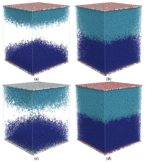 In the first part of the simulation, the entire simulation box was filled with monomer and the initiator was randomly placed on both surfaces with a given grafting density. For the model of polymer synthesis, the controlled living irreversible radical polymerization was chosen; i.e., the process of attachment of monomers to a growing chain was irreversible and a reaction rate p = 10−6 was assumed (this choice was based on our previous findings—see [22,59] for details). The polymer layer grew until it reached the desired DPn value, which lasted even up to 5 × 108 time steps. The above criterion of polymerization termination leads to the generation of polydisperse systems, which makes the theoretical interpretation difficult but much better reflects the properties of real brush systems [22]. Then the reaction was stopped, and the unreacted monomer was replaced by an inert solvent of the same size as the monomer. The second step was a production run to collect uncorrelated data; it lasted 5 × 108 time steps. The ‘grafting from’ procedure where chains grow very slowly was found to be an efficient tool for the simulation of dense brushes [22]. Faster ‘grafting from’ polymerization process requires very long equilibration [59], while attaching to the surface previously prepared whole is completely ineffective.