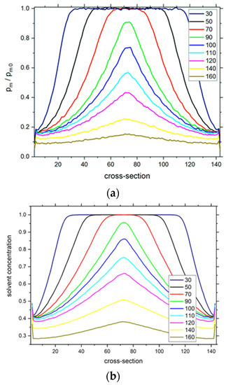 The dynamic properties of the solvent are discussed as a first point of the dynamic properties of the simulated system. The mobility of solvent was calculated as the probability of motion pm of a solvent molecule, i.e., the ratio of the number of performed moves in a given lattice node (when it was occupied by solvent) and the total time units in a simulation production run. This probability was averaged over the given plane xy. The probability of motion is connected to the movement waiting time, and a detailed discussion on these issues was already presented elsewhere [50,68]. In Figure 4 the reduced mobility is presented, i.e., mobility divided by the mobility calculated for solvent molecules in the solution without the presence of polymer chains pm0 = 0.0588 [68]. Figure 4 presents the changes in the reduced mobility of solvent molecules in the brush across the slit for different degrees of polymerization DPn. One can observe that the shapes of curves are almost opposite to those of the polymer density profiles presented in Figure 1. Significant changes in the probability of motion across the slit prove the heterogeneity of the system studied. The reduction in the solvent mobility is of an order of magnitude across the whole slit in the system with the highest degree of polymerization (DPn = 160). For opposing polymer brushes consisting of shorter chains, the reduction in pm is almost the same but only in the neighborhood of the grafting surfaces.
